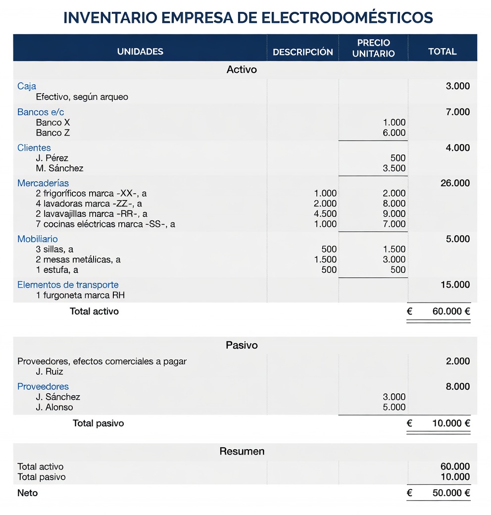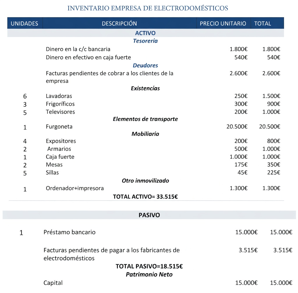 Activos: Bancos c/c (SD), Caja (SD), Clientes (SD), Construcciones (SD), Créditos a corto plazo (SD), Deudores (SD), Efectos comerciales a cobrar (SD), Elementos de transporte (SD), Maquinaria (SD), Mercaderías (SD), Mobiliario (SD), Terrenos y bienes naturales ( SD).