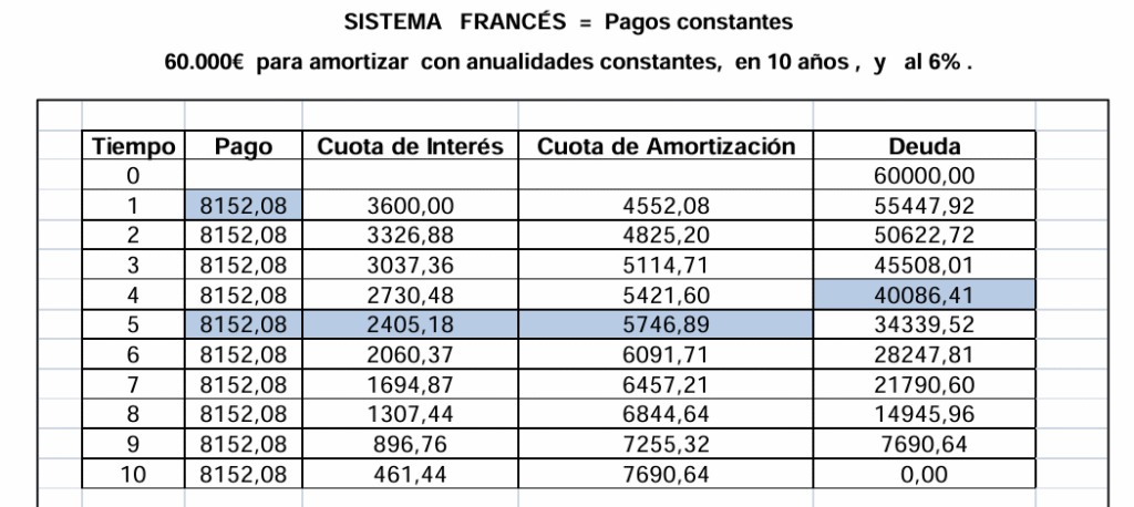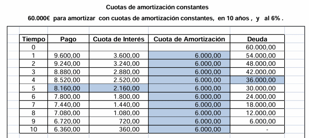 - cuota de pago (Cp): lo que paga el prestatario en cada periodo. Es la suma de lo que devuelve de capital prestado y los intereses.