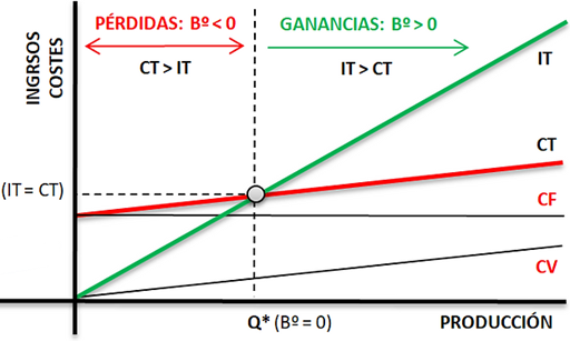 Umbral de rentabilidad = Q* = \(\large \frac{coste fijo}{precio de venta – coste variable unitario}\)