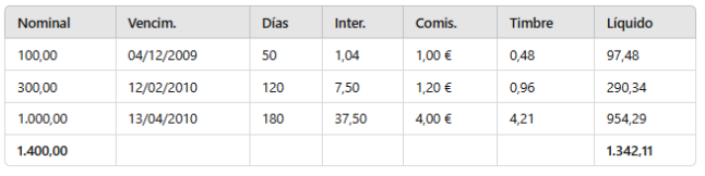 >Un cliente nos entrega un efecto comercial de nominal 4.500 € y vencimiento 3 meses, y decidimos descontarlo en una entidad financiera, que nos ofrece cuatro posibilidades: