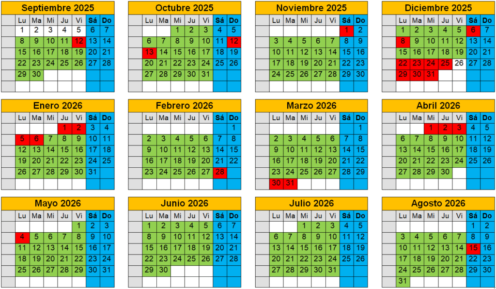 CALENDARIO DÍAS DE APERTURA DEL CENTRO DURANTE CURSO 2025-2026 Días de apertura del centro en verde. / Festividades en rojo. Ir a la portada