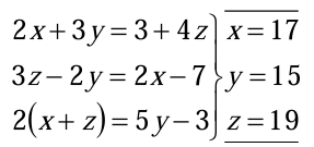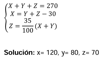 11. EJERCICIO: Una papelería tiene un total de 270 bolígrafos de tres tipos x, y, z . Del tipo x tienen 30 unidades menos que de la totalidad de y más z, y del tipo z tienen el 35% de la suma de x más y. ¿Cuántos bolígrafos de cada tipo hay en la librería?