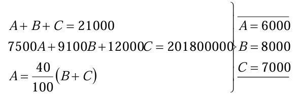 6. EJERCICIO: Un país importa 21 000 vehículos mensuales de 3 marcas A, B, C, al precio de 7500; 9100 y 12000 euros, respectivamente. Si el total de la importación asciende a 201,8 millones de euros y de la marca A importa el 40% de las otras dos marcas juntas, ¿cuántos vehículos de cada mar entran en el país?