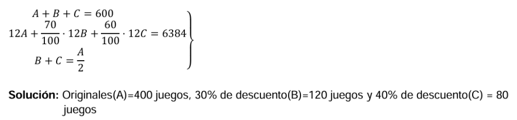 7. EJERCICIO: Una tienda ha vendido 600 ejemplares de un videojuego por un total de 6384€. El original costaba 12€, pero también ha vendido copias, presuntamente defectuosas, con un descuento del 30% y 40%. Sabiendo que el número de copias vendidas fue la mitad del de originales, calcular a cuántas copias se le aplicó el descuento del 30%.