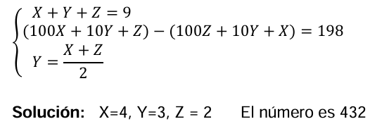 8. EJERCICIO: Hallar un número de 3 cifras, sabiendo que suman 9, que si al número dado se le resta el que resulta de invertir el orden de sus cifras, la diferencia es de 198; y que además, la cifra de las decenas es la media aritmética de las otras dos.