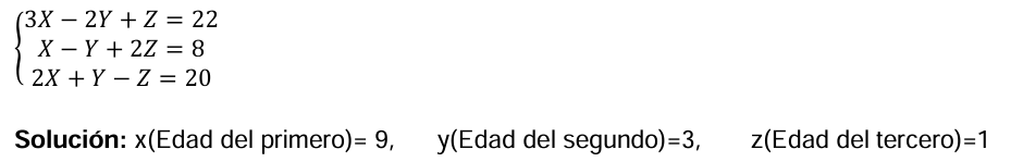 9. EJERCICIO: Averigua la edad de tres hermanos, sabiendo que el triple de la edad del primero menos el doble de la edad del segundo más la del tercero hacen un total de 22 años; la edad del primero menos la del segundo más el doble de la del tercero son 8 años; y el doble de la del primero más la del segundo menos la del tercero son 20 años.