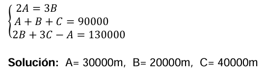 10. EJERCICIO: La distancia de tres playas (A, B, C) al lugar de veraneo de una familia es tal que el doble de la distancia de A es el triple de la distancia a B. La suma de las distancias A, B y C es de 90.000m, y el doble de la distancia a B más el triple de la distancia a C menos la distancia a A es igual a 130.000 m. ¿Cuál es la distancia de cada playa?