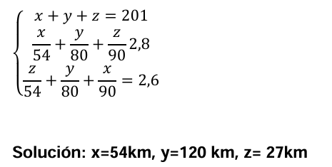 12. EJERCICIO: 2) Un vehículo todo terreno sube las cuestas a 54 km/h, las baja a 90 km/h, y en llano lleva una velocidad de 80 km/h. Para ir de una ciudad a otra que dista de ella 201 km emplea 2,8 horas y para volver 2,6 horas. ¿Cuántos kilómetros de camino llano hay entre ambas ciudades?